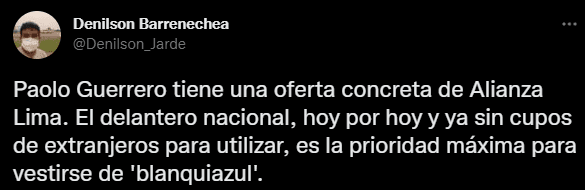 El comunicador social, Denilson Barrenechea, en su cuenta de Twitter reveló este dato que se hizo tendencia rápidamente: “Paolo Guerrero tiene una oferta concreta de Alianza Lima. El delantero nacional, hoy por hoy y ya sin cupos de extranjeros para utilizar, es la prioridad máxima para vestirse de ‘blanquiazul'”.
