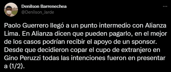 El periodista deportivo, Denilson Barrenechea, en su cuenta de Twitter mencionó primero, con el tema desarrollado: “Paolo Guerrero llegó a un punto intermedio con Alianza Lima. En Alianza dicen que pueden pagarlo, en el mejor de los casos podrían recibir el apoyo de un sponsor”.