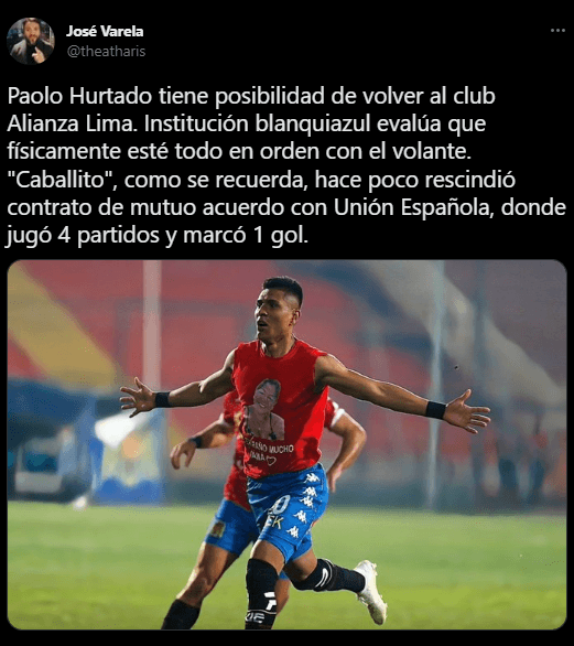 “Paolo Hurtado tiene la posibilidad de volver al club Alianza Lima. Institución blanquiazul evalúa que físicamente esté todo en orden con el volante. “Caballito”, como se recuerda, hace poco rescindió contrato de mutuo acuerdo con Unión Española, donde jugó 4 partidos y marcó 1 gol”. Fue lo que presentó en sus redes sociales el comunicador social.