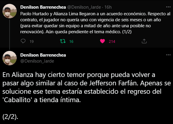 El periodista peruano, Denilson Barrenechea, brindó detalles sobre esta situación: “Paolo Hurtado y Alianza Lima llegaron a un acuerdo económico. Respecto al contrato, el jugador no quería uno con vigencia de seis meses o un año (para evitar quedar sin equipo a mitad de año ante una posible no renovación). Aún queda pendiente el tema médico”.
