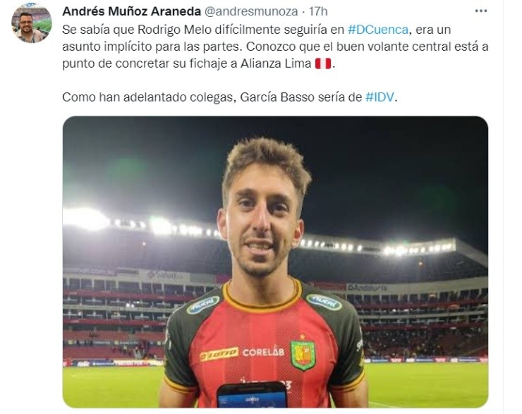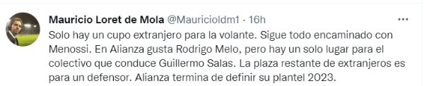 “Solo hay un cupo extranjero para la volante. Sigue todo encaminado con Menossi. En Alianza gusta Rodrigo Melo, pero hay un solo lugar para el colectivo que conduce Guillermo Salas. La plaza restante de extranjeros es para un defensor. Alianza termina de defirnir su plantel 2023”, comentó el periodista Mauricio Loret de Mola.