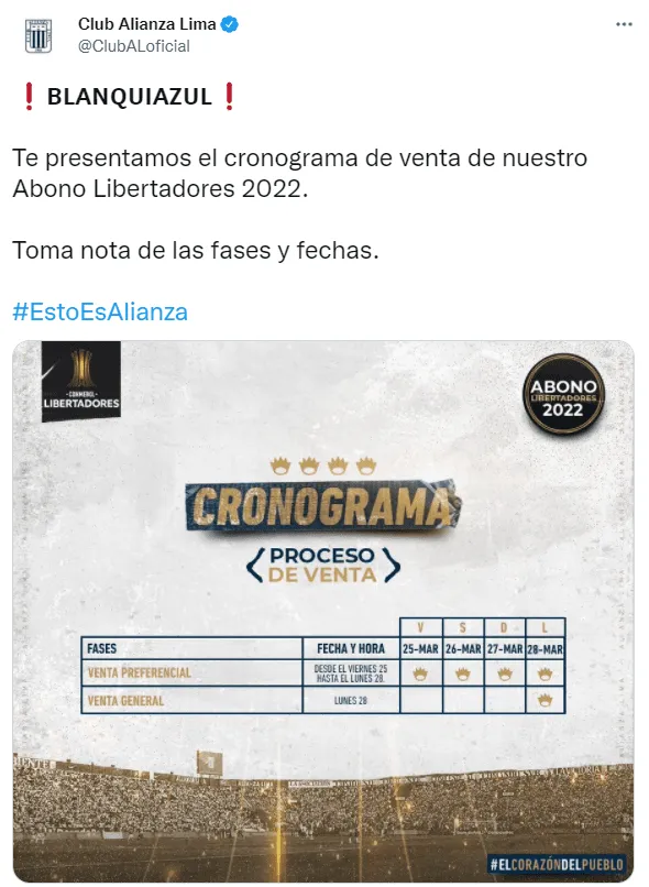 En ese sentido, la directiva del club de La Victoria anunció a través de sus redes sociales la venta de ‘Abono Libertadores’, donde manifiestan, que habrá preventa para los socios, abonados 2022 de la Liga 1, y para el público en general. La venta preferencial comenzará este viernes y durará hasta el lunes 28 de marzo, último día cuando se abre la venta general para el resto de hinchas blanquiazules.