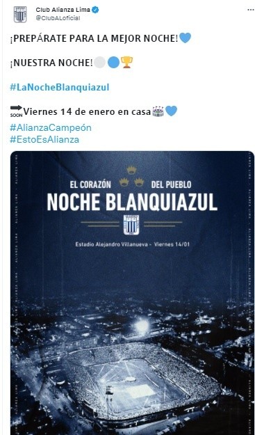 “¡Prepárate para la mejor noche! ¡Nuestra noche! La Noche Blanquiazul será el viernes 14 de enero en casa”, fue el mensaje que compartió el club blanquiazul a través de sus redes sociales.