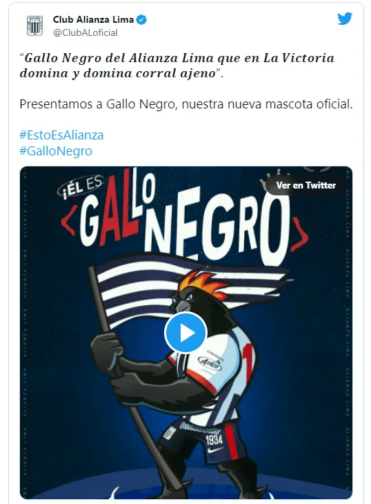 “Gallo Negro del Alianza Lima que en La Victoria domina y domina corral ajeno. Presentamos a Gallo Negro, nuestra nueva mascota oficial”, fue el mensaje delclub íntimo en sus redes sociales tras presentar oficialmentea su nueva mascota.