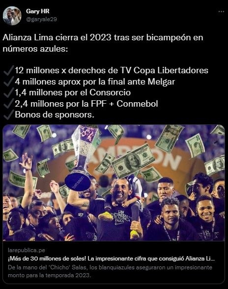 El periodista deportivo del Diario La República, Gary Alejandro, compartió en su cuenta de Twitter, un artículo donde resume a la perfección el trabajo desde el ambiente marketero, económico, y de resultados que gestionó la directiva Blanquiazul. Así abre su participación el comunicador social: “Alianza Lima cierra el 2022 tras ser bicampeón en números azules”.