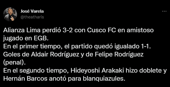 José Varela resumió a la perfección, lo que sucedió en la capital, tras el pitazo inicial: “Alianza Lima perdió 3-2 con Cusco FC en amistoso jugado en EGB. En el primer tiempo, el partido quedó igualado 1-1. Goles de Aldair Rodríguez y de Felipe Rodríguez (penal). En el segundo tiempo, Hideyoshi Arakaki hizo doblete y Hernán Barcos anotó para los blanquiazules”.