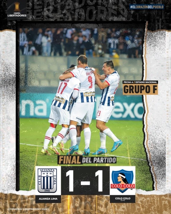 El pasado jueves 5 de mayo,Alianza Lima empató 1-1 anteColo Colo por la jornada 4 del grupo F en la Copa Libertadores, partido que se llevó a cabo en el estadio Nacional de Lima. Wilmer Aguirre anotó la igualdad para los dirigidos por Carlos Bustos,que sumaron su primer punto en el torneo continental a falta de dos fechas para concluir esta etapa del certamen.