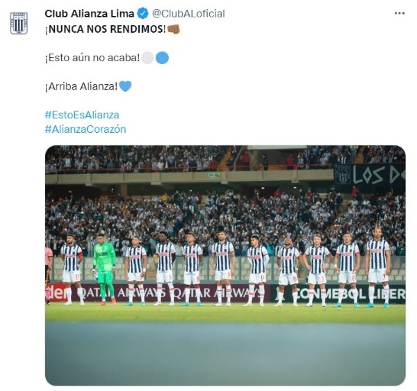 Los ‘Blanquiazules’ amanecieron en sus redes sociales con una frase alentadora, la cual indica: “¡Nunca nos rendimos! ¡Esto aún no acaba! ¡Arriba Alianza!”, fue lo que publicó el conjunto ‘Íntimo’ en su cuenta de Twitter luego del empate frente a Colo Colo por la Copa Libertadores donde indican que pelearán hasta el último para clasificar a la siguiente ronda en el torneo continental.