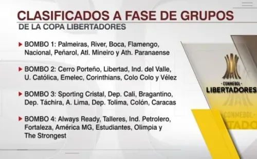 En ese sentido, y teniendo claro cuáles son cada uno de los bombos, el sorteo de la Copa Libertadores se puede generar a partir de la única condición expuesta en el párrafo anterior. Así pues, Alianza Lima y Sporting Cristal, ubicados en el bombo 3, pueden empezar a definir qué clubes no les va a tocar al estar en su mismo “bombo”.