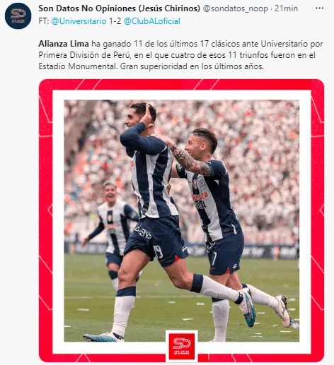 Hasta que llegó el primer tanto del clásico, por medio de uno de los grandes refuerzos que trajo Alianza Lima para afrontar la Liga 1 y Copa Libertadores 2023. A los 18′ minutos del partido, aparece Gino Peruzzi para dar una buena asistencia al colombiano Pablo Sabbag para anotar el primer gol del Clásico del Fútbol Peruano.