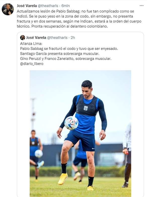 “Pablo Sabbag se fracturó el codo y tuvo que ser enyesado. Santiago García presenta sobrecarga muscular. Gino Peruzzi y Franco Zanelatto, sobrecarga muscular”, comentó el hombre de prensa en su cuenta de Twitter.