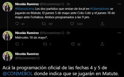 Ante algunas dudas por desmentidas de esta información, hechas por otros comunicadores, adjuntó la siguiente documentación: “Acá la programación oficial de las fechas 4 y 5 de CONMEBOL donde indica que se jugarán en Matute”. La imagen dice claramente el ‘Estadio Alejandro Villanueva’, así que de no existir cambios repentinos, serán ahí los partidos.