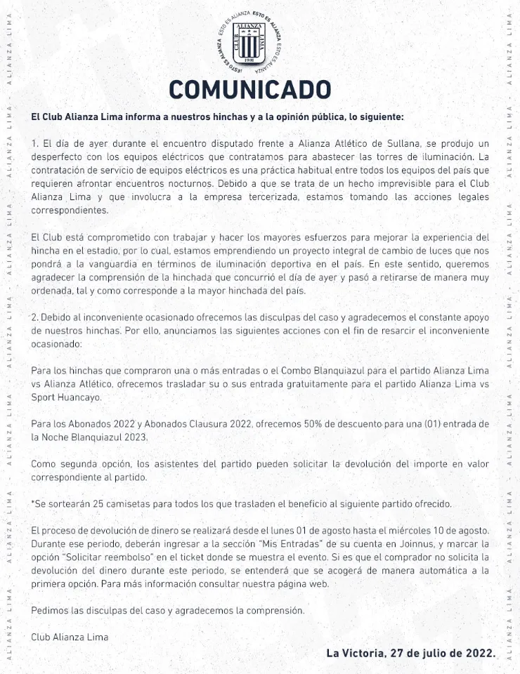 1. El día de ayer durante el encuentro disputado frente a Alianza Atlético de Sullana se produjo un desperfecto con los equipos eléctricos que contratamos para abastecer las torres de iluminación. La contratación de servicio de equipos eléctricos es una práctica habitual entre todos los equipos del país que requieren afrontar encuentros nocturnos. Debido a que se trata de un hecho imprevisible para el club Alianza Lima y que involucra a la empresa tercerizada, estamos tomando las acciones legales correspondientes.
