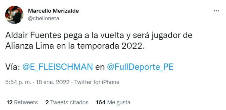 “Aldair Fuentes pega a la vuelta y será jugador de Alianza Lima en la temporada 2022”, reveló Marcelo Merizalde, periodista deportivo del canal digital ‘Full Deporte’.
