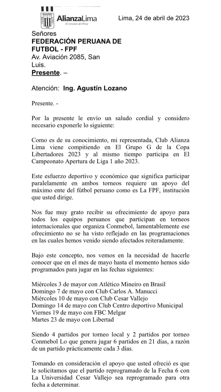 “Nos fue muy grato recibir su ofrecimiento de apoyo para todos los equipos peruanos que participan en torneos internacionales que organiza Conmebol, lamentablemente ese ofrecimiento no se ha visto reflejado en las programaciones en las cuales hemos venido siendo afectados reiteradamente (…) Siendo 4 partidos por torneo local y 2 partidos por torneo Conmebol Lo que genera jugar 6 partidos en 21 días, a razón de un partido prácticamente cada 3 días. Tomando en consideración el apoyo que usted ofreció es que le solicitamos que el partido reprogramado de la Fecha 6 con La Universidad César Vallejo sea reprogramado para otra fecha a determinar”, se lee en el documento compartido por el periodista, Carlos Benavente.