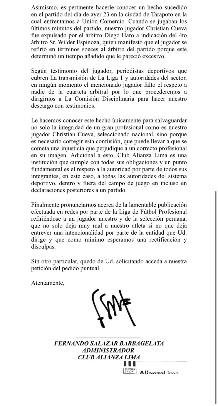 “Asimismo, es pertinente hacerle conocer un hecho sucedido en el partido del día de ayer 23/4 en la ciudad de Tarapoto, en la cual enfrentamos a Unión Comercio. Cuando se jugaban los últimos minutos del partido, nuestro jugador Christian Cueva fue expulsado por el árbitro Diego Haro a indicación del 4to árbitro Sr. Wilder Espinoza, quien manifestó que el jugador se refirió en términos soeces al árbitro del partido porque este determinó un tiempo añadido que le pareció excesivo. Según testimonio del jugador, periodistas deportivos que cubren La transmisión de La Liga 1 y autoridades del sector, en ningún momento el mencionado jugador faltó el respeto a nadie de la cuarteta arbitral, por lo que procederemos a dirigirnos a La Comisión Disciplinaria para hacer nuestro descargo con testimonios. Le hacemos conocer este hecho únicamente para salvaguardar no solo la integridad de un gran profesional como es nuestro jugador Christian Cueva, seleccionado nacional, sino porque es necesario corregir esta confusión, que puede llevar a que se cometa una injusticia que perjudique a un correcto profesional en su imagen, precisaron.