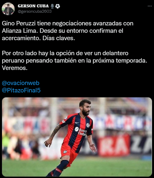 Gerson Cuba en su cuenta de Twitter revela este hecho “Gino Peruzzi tiene negociaciones avanzadas con Alianza Lima. Desde su entorno confirman el acercamiento. Días claves. Por otro lado, hay la opción de ver un delantero peruano pensando también en la próxima temporada. Veremos”.