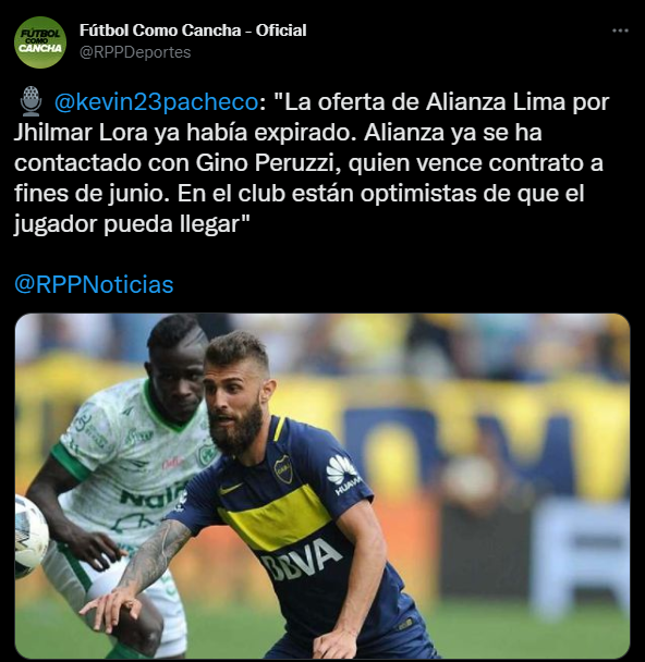 Contrastada, y en una línea paralela, por el periodista de ‘RPP Noticias’, Kevin Pacheco, que va un poco más allá con su afirmación “La oferta de Alianza Lima por Jhilmar Lora ya había expirado. Alianza ya se ha contactado con Gino Peruzzi, quien vence contrato a fines de junio. En el club están optimistas de que el jugador pueda llegar”.