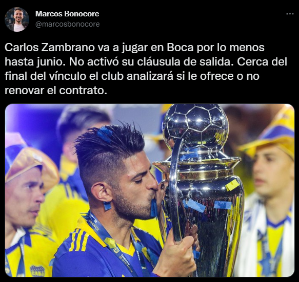 La información al detalle nos dice lo siguiente, sorprendiéndonos a todos, hasta a los propios seguidores del cuadro campeón del balompié albiceleste: “Carlos Zambrano va a jugar en Boca por lo menos hasta junio. No activó su cláusula de salida. Cerca del final del vínculo, el club analizará si le ofrece o no renovar el contrato”.