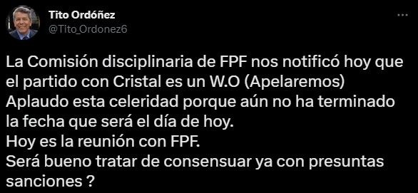 Tito Ordoñez en su cuenta de Twitter, soltó la siguiente reflexión: “La Comisión disciplinaria de la FPF nos notificó hoy que el partido con Cristal es un W.O (Apelaremos). Aplaudo esta celeridad porque aún no ha terminado la fecha que será el día de hoy. Hoy es la reunión con la FPF. ¿Será bueno tratar de consensuar ya con presuntas sanciones?”.