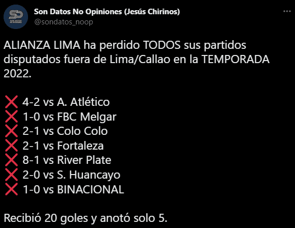 Con el siguiente titular, que es bastante significativo para quien lo vea desde el ojo más crítico: “ALIANZA LIMA ha perdido TODOS sus partidos disputados fuera de Lima/Callao en la TEMPORADA 2022”. Para después revisar la lista que se plantea en esta oportunidad, porque son todas derrotas como bien precisa.
