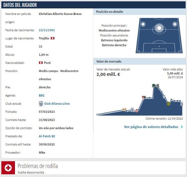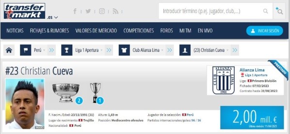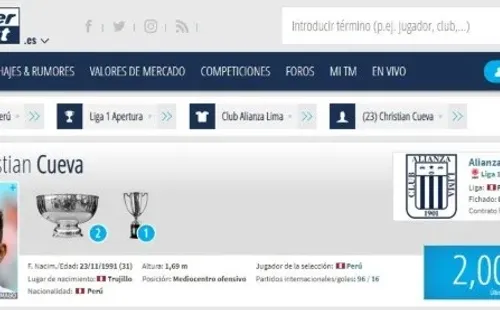 Sus pocos minutos en cancha, la lesión reciente y el rendimiento bajo está golpeando en su valor en el mercado. Christian Cueva llegó con una cifra por encima de los 2 millones de euros a la Liga 1. Pero al día de hoy, sufrió un bajón de consideración máxima.