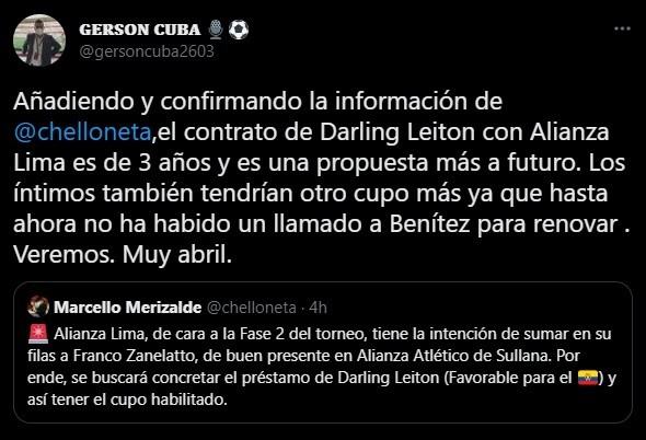 Para darle un refuerzo a esta data, apareció Gerson Cuba, quien contó lo siguiente: “Añadiendo y confirmando la información de Marcello Merizalde, el contrato de Darling Leiton con Alianza Lima es de 3 años y es una propuesta más a futuro. Los íntimos también tendrían otro cupo más, ya que hasta ahora no ha habido un llamado a Benítez para renovar. Veremos. Muy abril”. Entonces serían dos salidas para la mitad de temporada, según podemos entender. No solo Leiton, sino también el querido ‘Pájaro’. Habrá que ver.