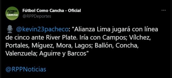 De esta manera lo reveló en ‘Fútbol Como Cancha’ de RPP Noticias, el periodista especializado con información ‘del equipo del pueblo’, Kevin Pacheco: “Alianza Lima jugará con línea de cinco ante River Plate. Iría con Campos; Vílchez, Portales, Míguez, Mora, Lagos; Ballón, Concha, Valenzuela; Aguirre y Barcos”.