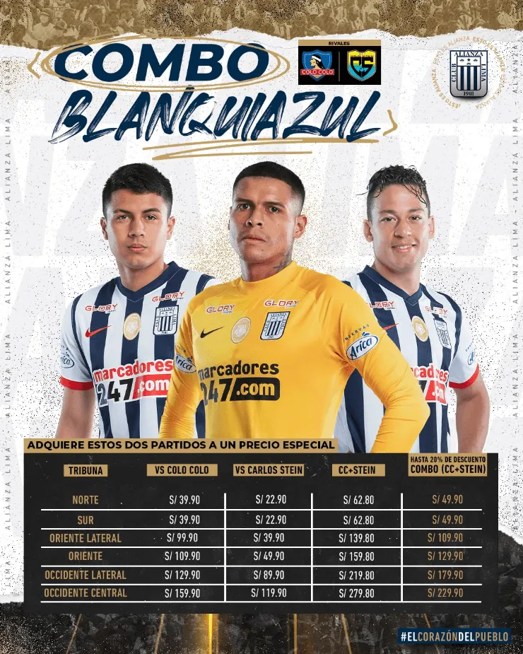 Con el objetivo de tener el apoyo total en las tribunas, Alianza Lima, presentóuna promoción para los hinchas ‘blanquiazules’, se trata de combos para los duelosante Carlos Stein, por la Liga 1, y Colo Colo por la ConmebolLibertadores 2022. Cabe resaltar que primero los dirigidos por Carlos Bustos enfrentarán este miércoles a Fortaleza.