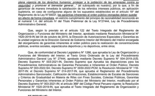 “Estimar la solicitud de garantías inherentes al orden público presentada por el club Alianza Lima, representado por el señor Diego Enrique Guerrero Alburqueque, para realizar un espectáculo público deportivo, denominado “Torneo Copa Conmebol Libertadores” entre los clubes deportivos Alianza Lima y River Plate, a desarrollarse el día 06 de abril del 2022, a partir de las 12:00 hasta las 22:00 horas, en el Estadio Nacional de Lima…”,dice parte del comunicado del Ministerio del Interior.