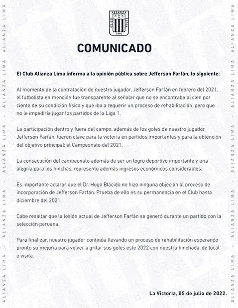 “Es importante aclarar que el Dr. Hugo Blácido no hizo ninguna objeción al proceso de incorporación de Jefferson Farfán. Prueba de ello es su permanencia en el club hasta diciembre del 2021. Cabe resaltar que la lesión actual de Jefferson Farfán se generó durante un partido con la Selección Peruana. Nuestro jugador continúa llevando un proceso de rehabilitación esperando su mejoría”, agregó el club de La Victoria.