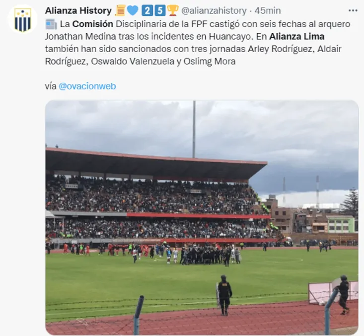 Por su parte, Arley Rodríguez, Aldair Rodríguez, Oswaldo Valenzuela y Oslimg Mora fueron castigados con tres partidos cada uno por sus actos tras el encuentro. De esta forma, Alianza Lima pierde a cinco jugadores para las últimas fechas del Torneo Apertura y para el inicio del Clausura. Sin embargo, el club ‘blanquiazul’ tiene la opción de apelar este fallo de la Comisión Disciplinaria.