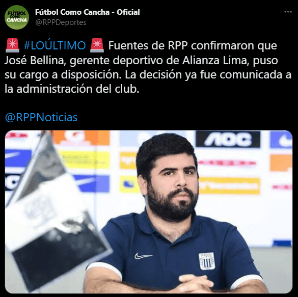El primer medio de comunicación que lanzó esta información fue ‘RPP Noticias’ en sus redes sociales: “Fuentes de RPP confirmaron que José Bellina, gerente deportivo de Alianza Lima, puso su cargo a disposición. La decisión ya fue comunicada a la administración del club”.