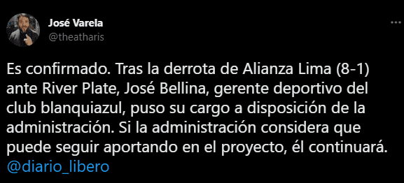 Minutos después, fue contrastado por el periodista del ‘Diario Líbero’, José Varela: “Es confirmado. Tras la derrota de Alianza Lima (8-1) ante River Plate, José Bellina, gerente deportivo del club blanquiazul, puso su cargo a disposición de la administración. Si la administración considera que puede seguir aportando en el proyecto, él continuará”. Las próximas horas serán claves para entender la situación definitiva.