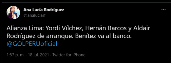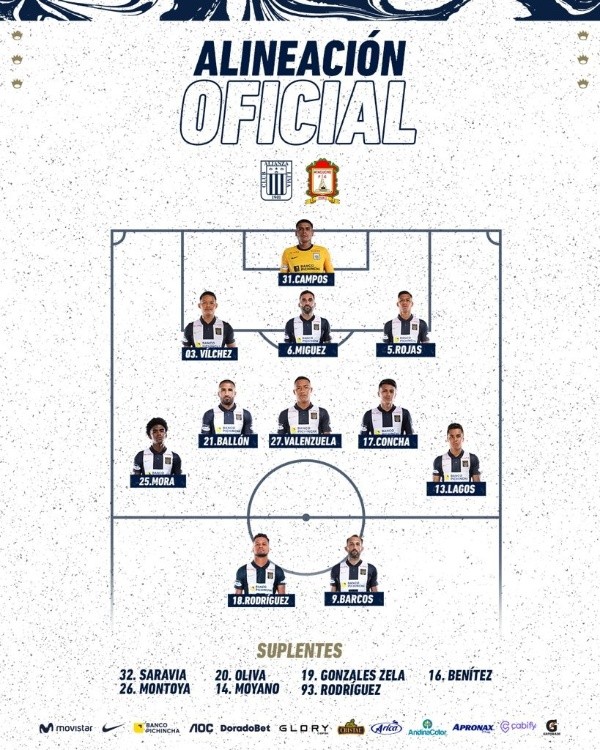 Alineación titular de Alianza Lima se dará de la siguiente manera: Ángelo Campos, Renato Rojas, Yordi Vilchez, Pablo Miguez, Ricardo Lagos, Oslimg Mora, Josepmir Ballon(C), Jairo Concha, Oswaldo Valenzuela, Hernán Barcos, Aldair Rodríguez