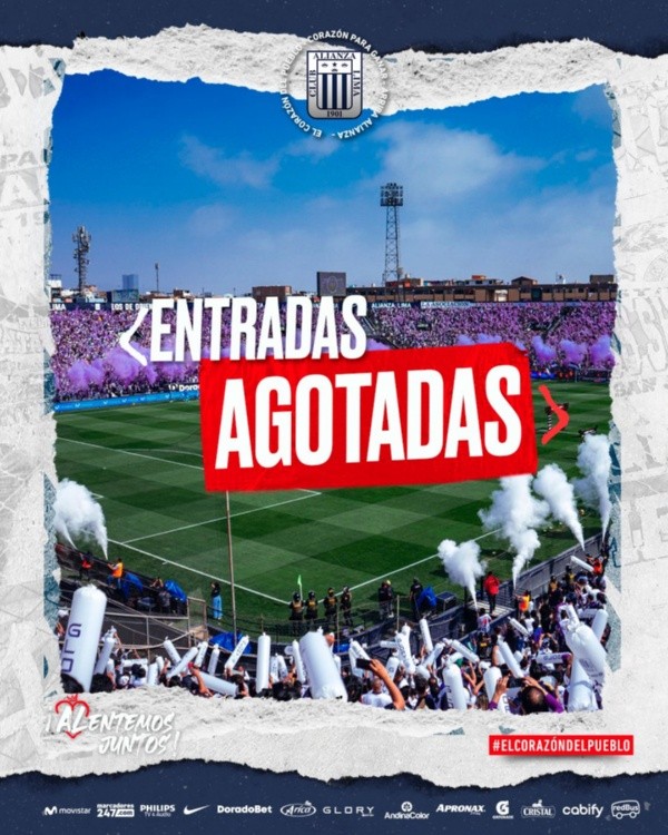 En ese sentido, se pudo conocer que el club Alianza Lima tiene la totalidad de los tickets vendidos. Así es, a dos días del partido de vuelta por la final de la Liga 1, no hay entradas disponibles. De esta manera, el estadio Alejandro Villanueva lucirá un lleno total, ¿pero de cuántos hinchas estamos hablando?