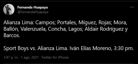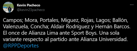 La información la presenta el periodista de RPP Noticias, Kevin Pacheco, quien señala lo siguiente: “Campos; Mora, Portales, Miguez, Rojas, Lagos; Ballón, Valenzuela, Concha; Aldair Rodríguez y Hernán Barcos”.