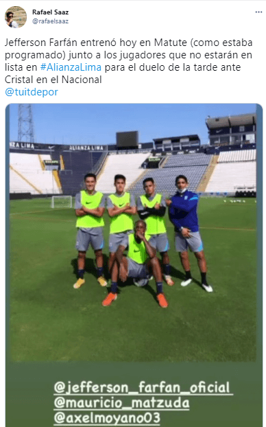 “Jefferson Farfán entrenó hoy en Matute (como estaba programado) junto a los jugadores que no estarán en lista en Alianza Lima para el duelo de la tarde ante Cristal en el Nacional”. Palabras exactas y explicación al detalle por parte del periodista deportivo, con respecto al tema del referente principal 2021 en el conjunto blanquiazul.