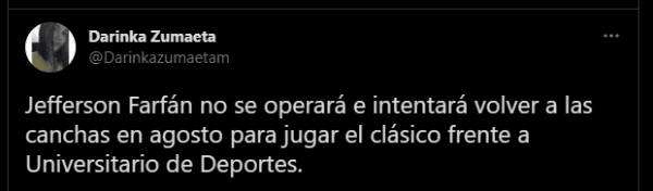 La información llega desde ESPN, la periodista Darinka Zumaeta brinda mayores detalles: “Jefferson Farfán no se operará e intentará volver a las canchas en agosto para jugar el clásico frente a Universitario de Deportes”.
