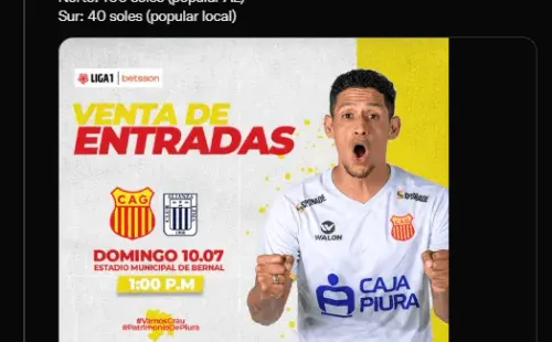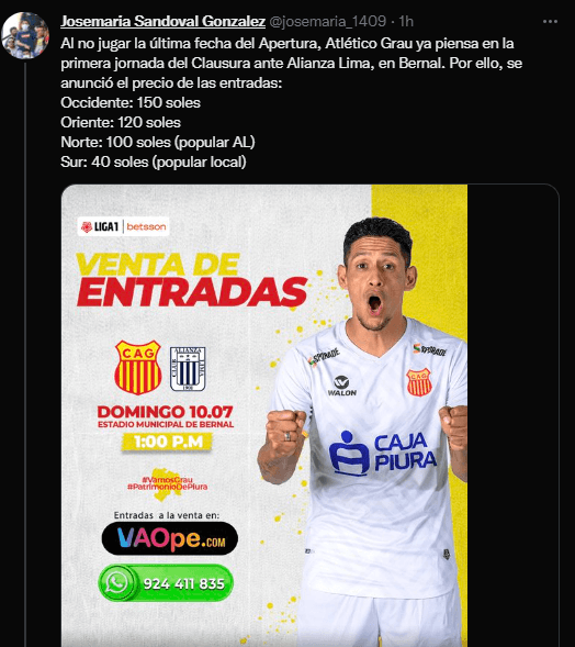 “Al no jugar la última fecha del Apertura, Atlético Grau ya piensa en la primera jornada del Clausura ante Alianza Lima, en Bernal. Por ello, se anunció el precio de las entradas: Occidente: 150 soles. Oriente: 120 soles. Norte: 100 soles (popular AL). Sur: 40 soles (popular local)”. Es lo que primero señala el joven comunicador, para después adjuntar detalles del equipo dueño de casa.