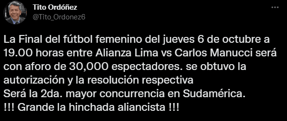 Mediante el delegado oficial de la ‘institución victoriana’, Tito Ordoñez, se conoció el petitorio del club, para ampliar el aforo para este jueves 6 de octubre a las (7:00 PM – HORA PERUANA): “La final del fútbol femenino del jueves 6 de octubre a las 7.00 p. m. entre Alianza Lima vs. Carlos Mannucci será con aforo de 30.000 espectadores. Se obtuvo la autorización y la resolución respectiva. Será la segunda mayor concurrencia en Sudamérica. ¡Grande la hinchada aliancista!”.
