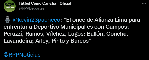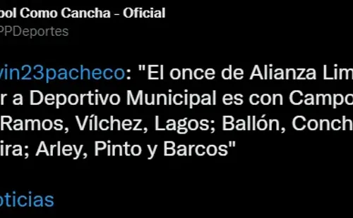 Lo que propone como dato exclusivo horas antes del cotejo, el comunicador social, es lo siguiente: “El once de Alianza Lima para enfrentar a Deportivo Municipal es con Campos; Peruzzi, Ramos, Vílchez, Lagos; Ballón, Concha, Lavandeira; Arley, Pinto y Barcos”. Con esto nos damos cuenta de algunos detalles que podemos explicar aquí mismo.