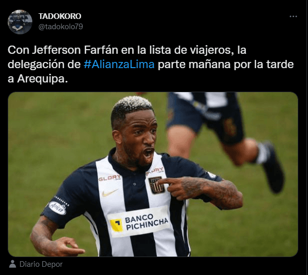 “Con Jefferson Farfán en la lista de viajeros, la delegación de Alianza Lima parte mañana por la tarde a Arequipa”, colocó el comunicador social. Generando en el hincha ferviente, unos ojos de ilusión máxima, por todo lo que significa para ellos la presencia del ex delantero del PSV Eindhoven. Desde lo emotivo para ellos, y lo psicológico para el rival.