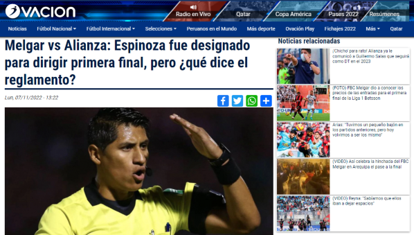 El popular portal peruano abre su detallado con la siguiente afirmación: “Sucede que en el artículo 121° del reglamento se señala a la letra que “los miembros de una cuarteta arbitral, incluidos adicionales y árbitros VAR, no podrán dirigir un partido de un club determinado, si no ha transcurrido por lo menos una fecha desde que intervino en otro partido del mismo club. Esta disposición incluye partidos oficiales de Torneos Internacionales””.