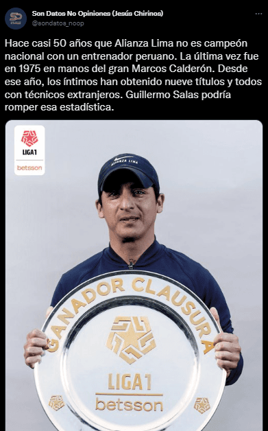 Mediante su cuenta de Twitter, Son Datos No Opiniones (Jesús Chirinos), presentó un detalle importante: “Hace casi 50 años que Alianza Lima no es campeón nacional con un entrenador peruano. La última vez fue en 1975 en manos del gran Marcos Calderón. Desde ese año, los íntimos han obtenido nueve títulos y todos con técnicos extranjeros. Guillermo Salas podría romper esa estadística”.