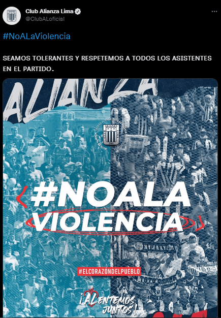 Mediante su cuenta principal de Twitter, Alianza Lima, envió un comunicado para todos sus seguidores, los cuales fueron tomados para bien por el pueblo ‘blanquiazul’. Esto señalaron: “sᴇᴀᴍᴏs ᴛᴏʟᴇʀᴀɴᴛᴇs ʏ ʀᴇsᴘᴇᴛᴇᴍᴏs ᴀ ᴛᴏᴅᴏs ʟᴏs ᴀsɪsᴛᴇɴᴛᴇs ᴇɴ ᴇʟ ᴘᴀʀᴛɪᴅᴏ”. Junto a un arte gráfico donde se puede ver el ‘NO A LA VIOLENCIA’ gigantesco.
