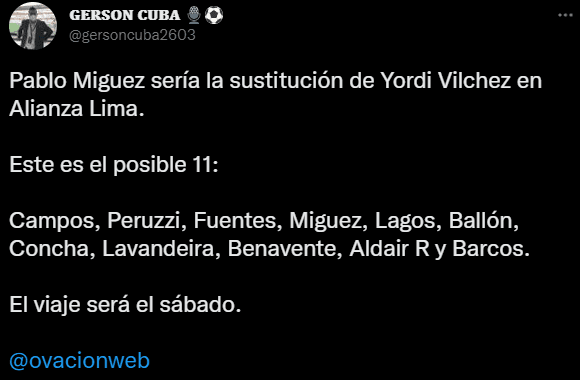 El periodista de ‘Radio Ovación’, Gerson Cuba, se animó a revelar cómo estaría formando Alianza Lima este domingo ante UTC en el ‘Estadio Héroes de San Ramón’. Este sería el parado desde el vamos: “Pablo Miguez sería la sustitución de Yordi Vilchez en Alianza Lima. Este es el posible 11: Campos, Peruzzi, Fuentes, Miguez, Lagos, Ballón, Concha, Lavandeira, Benavente, Aldair R y Barcos. El viaje será el sábado”.