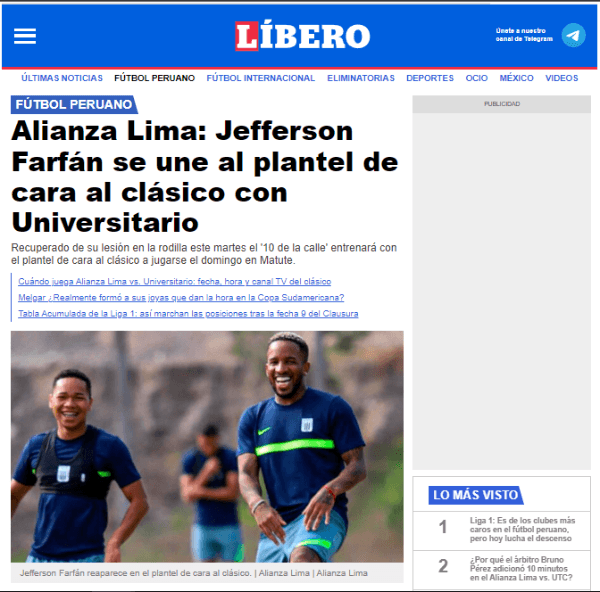 El periodista José Varela, comenta este dato, dentro de la web del popular medio de comunicación. Donde pone en contexto el trasfondo de todo lo que venimos contando: “Tras el minuto a minuto de la información sobre el retorno a la competición de Jefferson Farfán, diario LÍBERO anticipó que el futbolista trabajaba solo en el estadio de Matute previo al entrenamiento del plantel que disputa el Torneo Clausura. Ahora pudimos conocer que este martes trabajará con el grupo”.