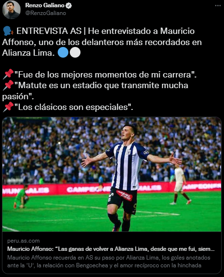 Además, agradeció a sus compañeros por hacerlo famoso cuando existían dudas sobre su rendimiento. Mauricio Affonso sabe que su trabajo dejó imágenes inolvidables “Uno como delantero siempre aspira hacer goles en cada partido. En este caso, en Alianza Lima se me dio una racha muy linda. Pude convertir muchos goles, ayudar al equipo a lograr los objetivos. El delantero vive un poco de rachas. Creo que estuve pasando por un momento muy bueno y lo pude disfrutar”.
