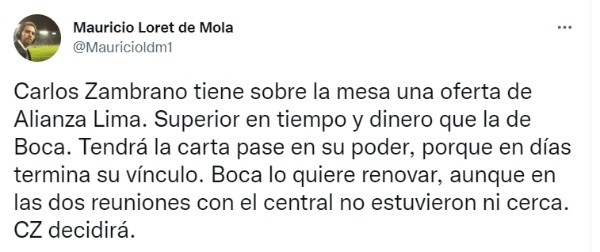 “Carlos Zambrano tiene sobre la mesa una oferta de Alianza Lima. Superior en tiempo y dinero que la de Boca Juniors. Tendrá la carta pase en su poder, porque en días termina su vínculo. Boca Juniors lo quiere renovar, aunque en las dos reuniones con el central no estuvieron ni cerca. Carlos Zambrano decidirá”, cerró Mauricio Loret de Mola en su cuenta de Twitter.